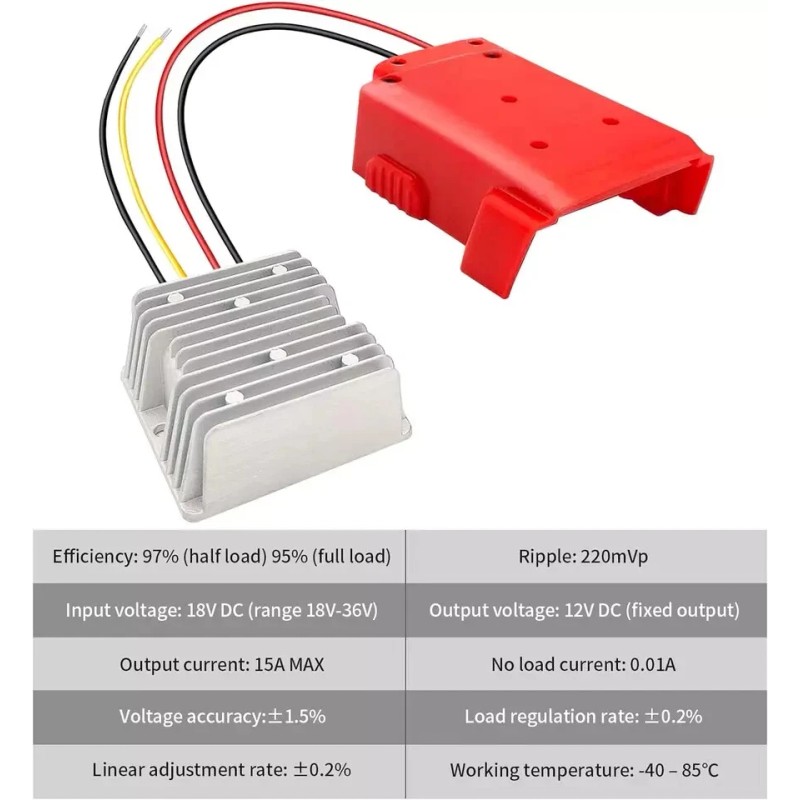 Zltoolpart power converter is made by the high heat conduction organic silica gel filling and sealing technology. This Voltage power step down Converter is Compatible with any Milwaukee M18 Batteries to 12V 15amp max, widely used in Bus, CMB,Fish finder, GPS navigation, solar power, photovoltaic energy, bus display, car audio, LCD TV, LED, intercom and other equLipment.