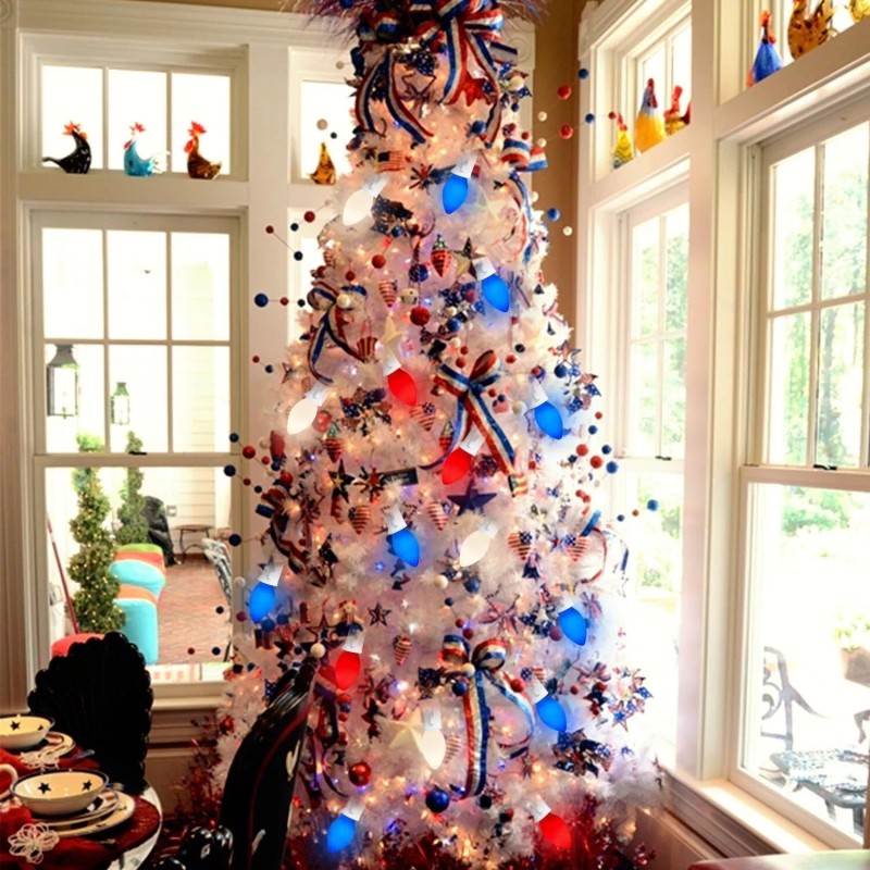 - These red white blue Fourth of July lights are versatile and ideal as Memorial Day decorations, 4th of July decorations, National Independence Day decorations, Presidents' Day decor and any patriotic occasion decor. Easily add rich American spirit to your home, backyard, garden, and gazebos with these C7 red white and blue decor lights. Let indoor outdoor red white blue lights illuminate your patriotic celebrations and honor the great spirit of America!