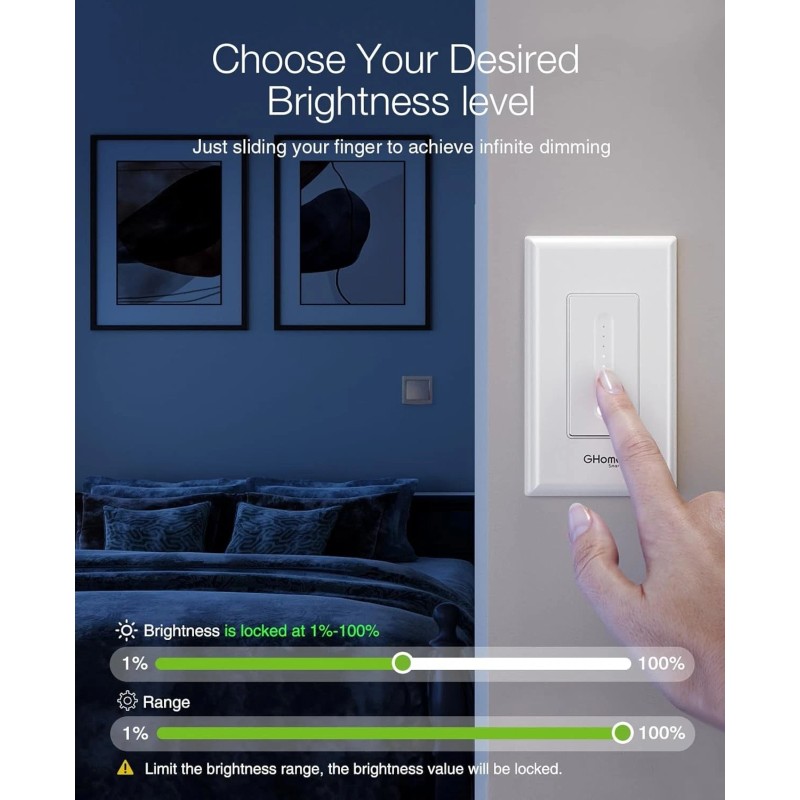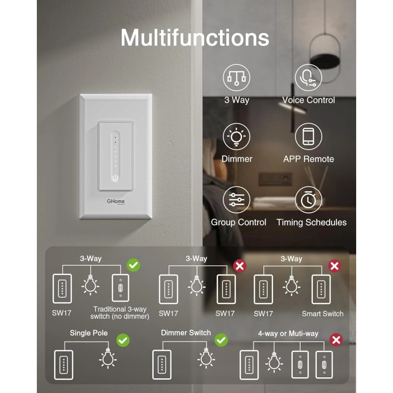 GHome Smart 3 Way Dimmer Smart Switch Can Work Separately Or Work with Traditional 3-Way Switch, Compatible with Alexa, Google Assistant, Neutral Wire Required, 2.4GHz WiFi Only, FCC Certified, 1 Pack