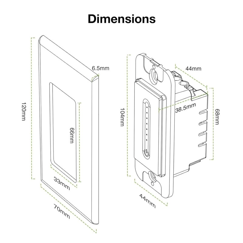 Just slide your finger to adjust the brightness, or set the optimal dimming range in the app to create a perfect atmosphere. Input: 120V~ 50/60Hz, Max output: 150W LED, 150W CFL, 450W INC.