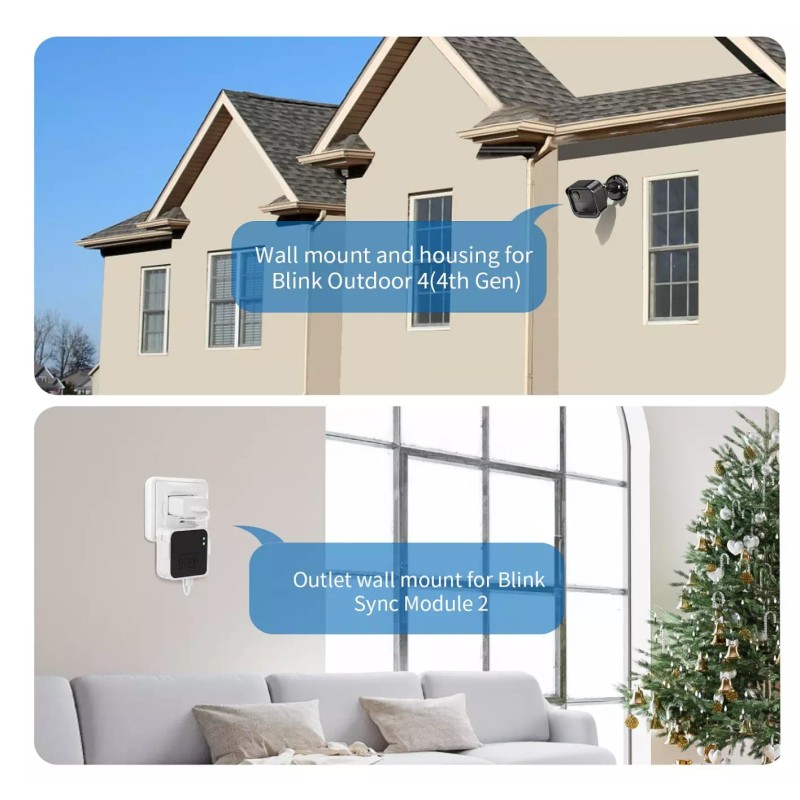 【Packing List】Each pack comes with 3 plastic weatherproof housings, 3 Blink Camera Mounts, 1 Outlet Mount for Blink Sync Module 2, 1 Customized short USB cord, 1 set necessary screws and anchors. (The camera and module are NOT included.)