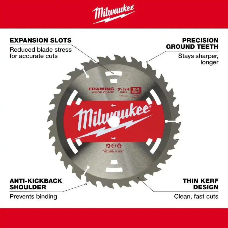 MILWAUKEE wood cutting, basic framing blade features precision ground tungsten Carbide teeth for fast, smooth cuts and cooling vents allow for long blade life. Ideally used with Softwoods, Hardwoods, Wet Lumber, Treated Lumber and Laminated Woods such as Plywood, OSB, LVL, PSL, LSL and OSL. Includes: (1) 7-1/4 in. 24 TPI Basic Framer Circular Saw Blade.