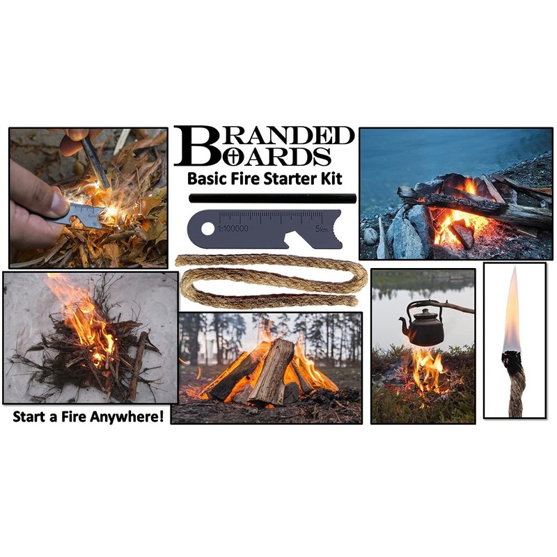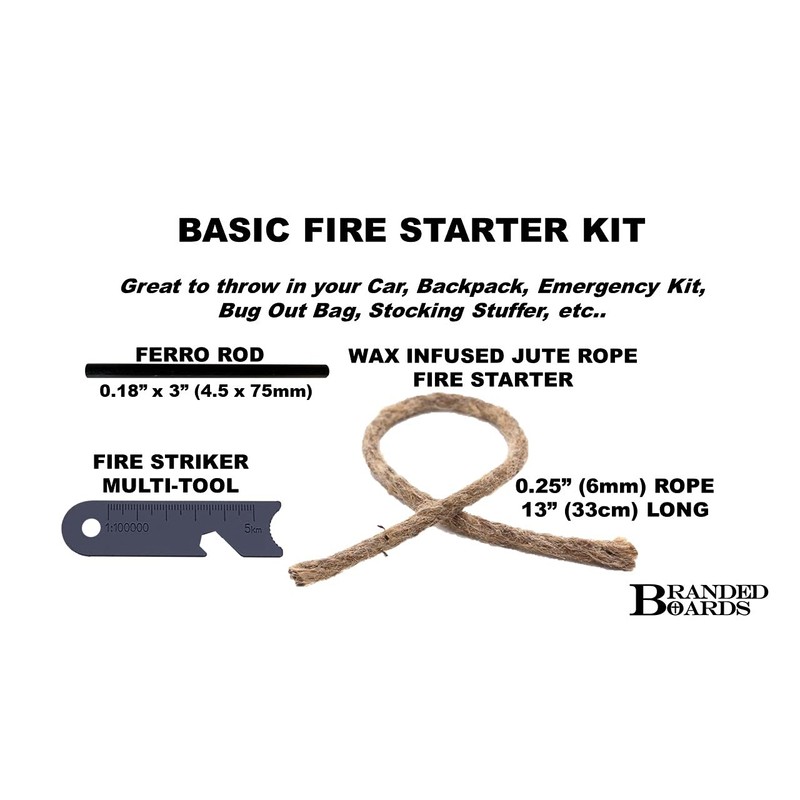 Branded Boards Bushcraft Survival Fire Starter Kit 4-Pack, Ferro Rod, Waxed Jute Rope Tinder & Fire Scraper (Basic FIRE Starter KIT 4-Pack)