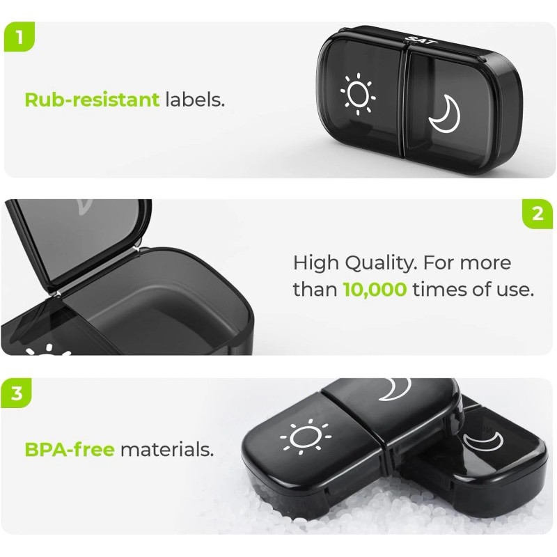 - Super Quality: The inner hinges are reinforced for 10,000 uses. The medication organizer letters were UV printed, which is long-lasting over 10,000 uses, never worry about the rub-off labels. Made of BPA-free materials that are harmless to humans. And canvas box never worry about breaking