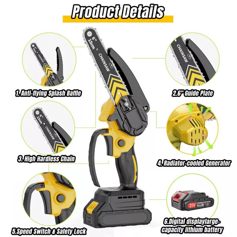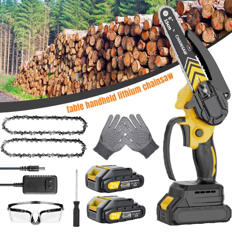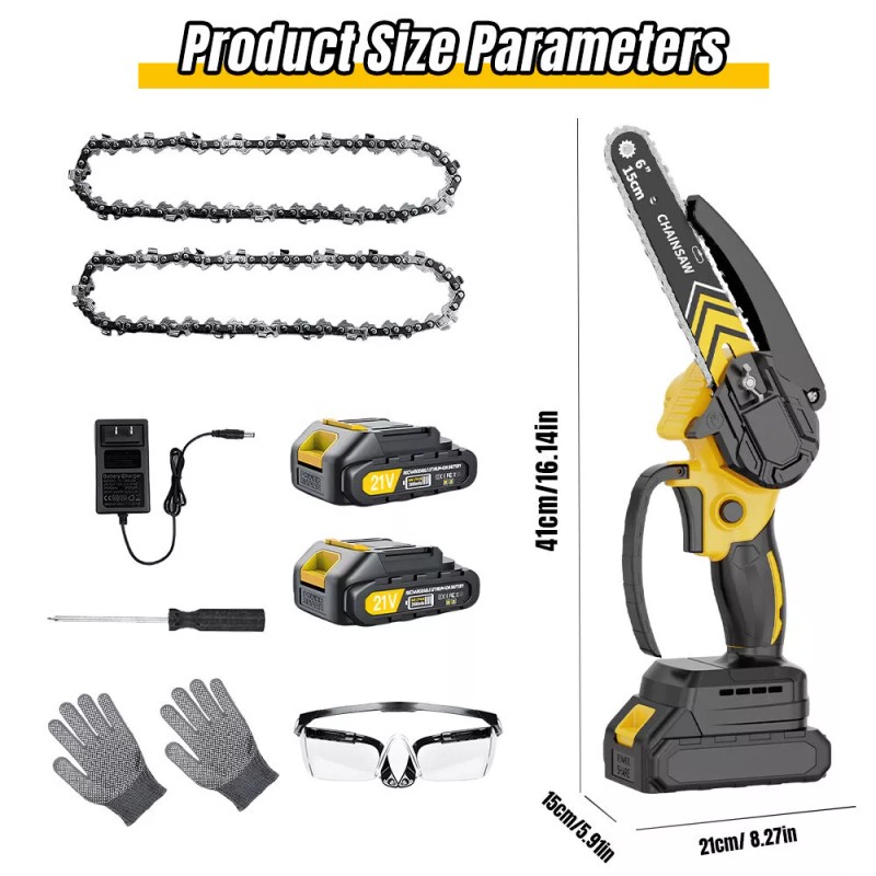 - ✅【Multiple Safety Features】mini chainsaw 6 inch cordless comes with several safety features. Unique double-sided safety switch design of the battery operated chainsaw prevents accidental start and can meet the needs of right-handed and left-handed people; Safety bezel and prevents wood splashing; Provide protective glasses to effectively prevent splashing into the user's eyes; rotatable top protective baffle prevents sawdust from splashing; A pair of gloves protect your hands.