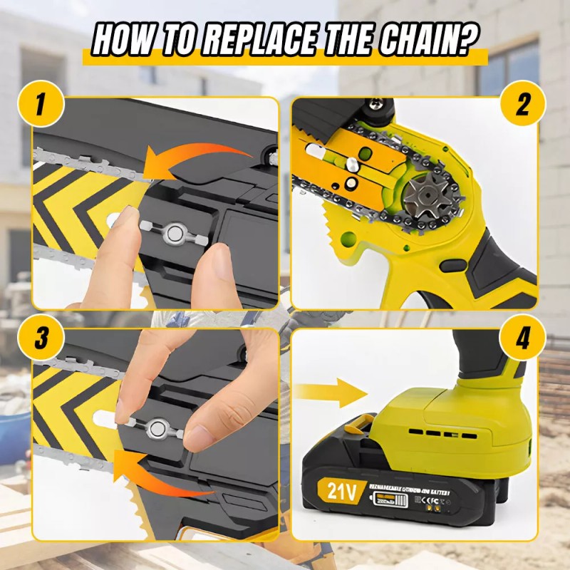 - ✅【Low Noise & Easy Maintain】cordless mini chainsaw producing noise of less than 70dB only in the operator's ear. You could get rid of branches without worried waking your neighbors. In addition, The handheld chainsaw battery powered is easier to store and less costly to maintain. If the chain slips or derails after work, you could simply adjust the chain adjustment knob to easily tighten the chain and regularly replace the chain to ensure that the pruning chainsaw always works like a new product.