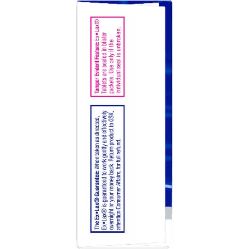 ex-lax Maximum Strength Stimulant Constipation Relief Pills are gentle laxatives that provide dependable relief of occasional constipation. This sennosides laxative works gently to effectively produce a bowel movement in as little as 6 to 12 hours. ex-lax gentle laxatives for constipation come in convenient tablet form, making them easy to dose with no mixing and no mess. Each maximum strength laxative tablet contains 25mg sennosides, 40mg calcium and 5mg magnesium. Adults and children 12 years and older may take two tablets once or twice daily, and children ages 6 to 11 years may take one tablet once or twice daily. Use ex-lax stimulant laxative pills for no longer than 7 days and for no other purpose than the relief of occasional constipation, unless directed otherwise by a doctor. Trust ex-lax for guaranteed relief every time.