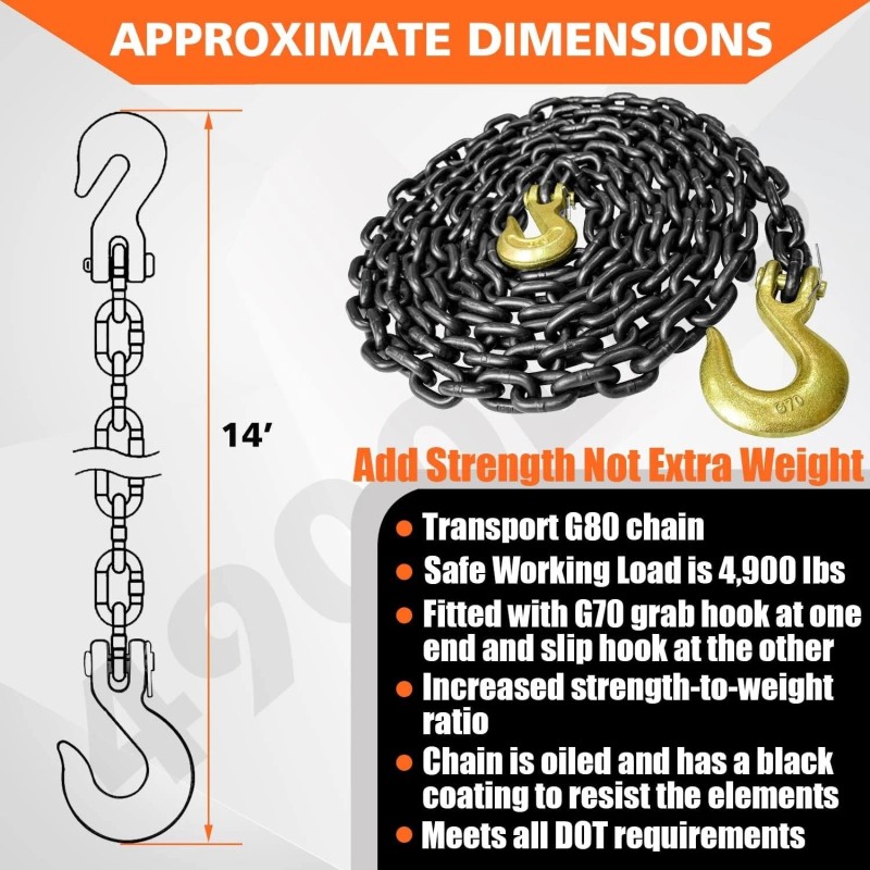 - PROFESSIONAL DESIGN -- Maximum capacity of 4900 lbs.!Grade 80 log chains are fitted with a grab hook at one end and a slip hook on the other, great for dragging and transporting heavy logs, towing and pulling.