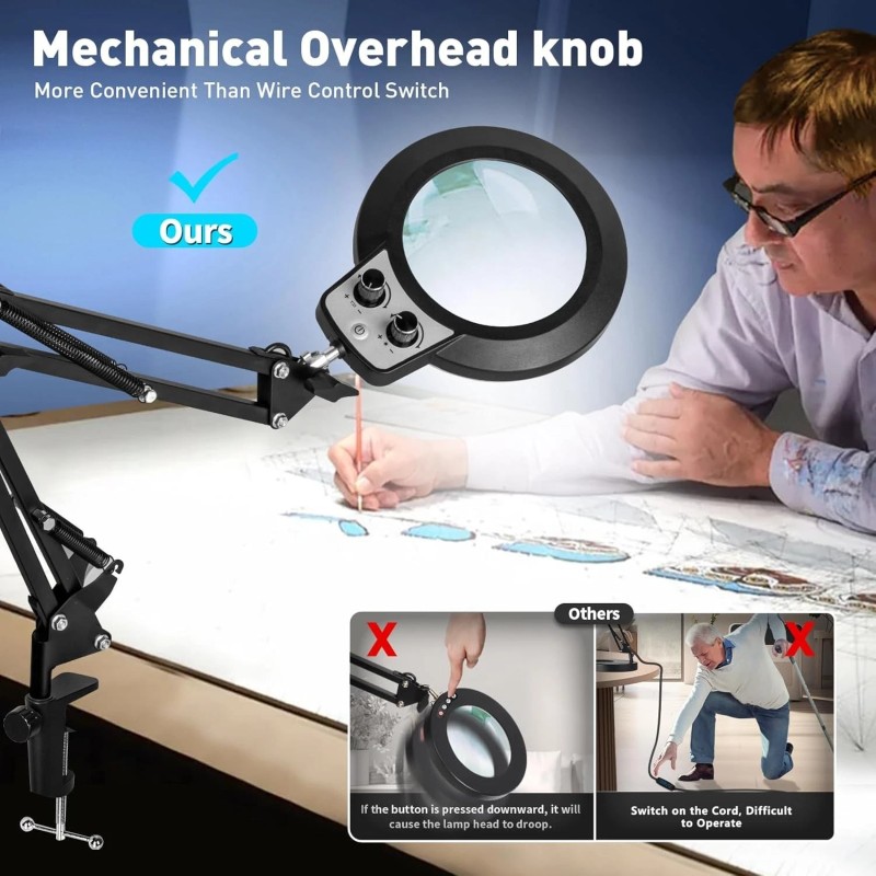 - The Latest Power Supply Solution: Magnifying glass with light adopts double knob adjustment scheme, Unlike traditional keys, which causing the lamp holder to fall. Turn on the switch, the knob on the left can adjust any brightness you want, and the knob on the right can adjust any color temperature you want, so our magnifying glass lamp can adjust the most suitable color and brightness combination for you. Suitable for any of your favorite scenes.