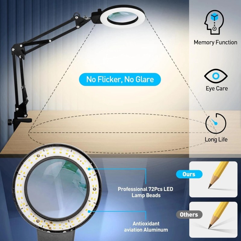 - Memory and Eye Protection Magnifying Light: When you adjust the color and brightness you want, turn off the switch directly. The next time you turn on the switch, it will be your exclusive setting, and you don't need to adjust it again. The led magnifying lamp emits uniform and soft light, with no flicker, no glare, no shadow, which can effectively relieve eye fatigue and protect your eyes. ideal for working, sleeping, studying, reading or relaxing.