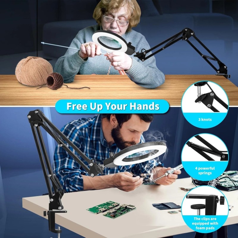 - Adjustable Swing Arm and Metal Clamp: Release your hands and enjoy our magnifying light with convenient swinging arm. The swing arms designed with 4 powerful springs and 3 knots to provide sturdy support. In addition, the heavy metal clip can be clamped at the edge of the table with a max of 2.1 inches, The upper and lower sides of the clip are equipped with foam pads, which completely prevent your table from being scratched and increase the stability of the clip. Choose the right way to use your magnifying desk & clamp lamp at will.