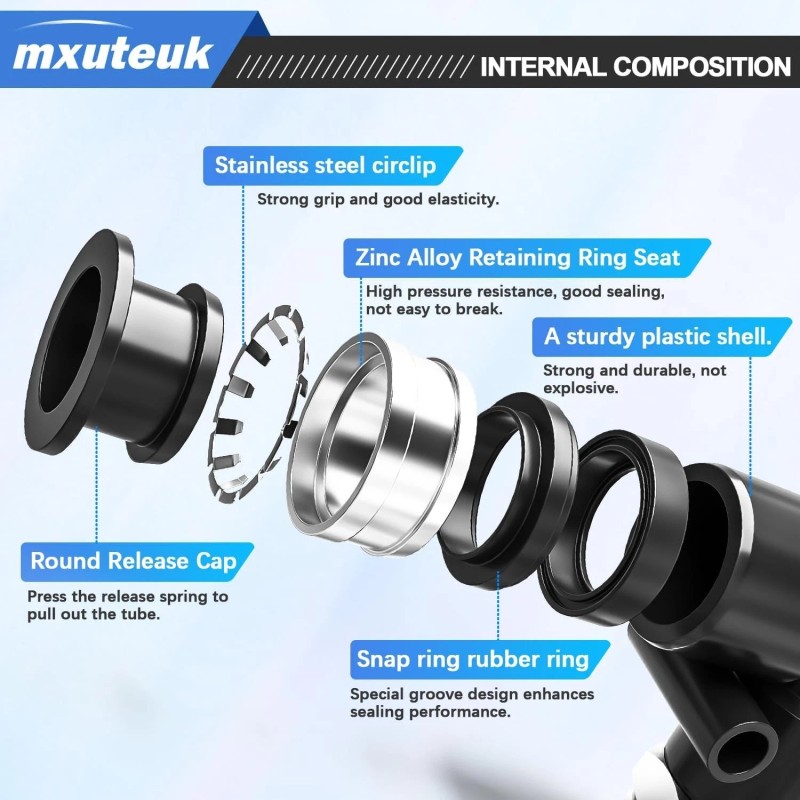 · 【Design】:These air hose fittings feature a circular release ring design, which facilitates easy installation and removal of hoses. Additionally, the bottle cap can rotate 360 degrees. An internal locking clip spring ensures that after engagement, the pneumatic tube is securely fastened, not easy to fall off.