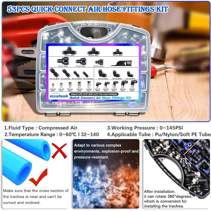 · This quick connect air hose fittings kit includes sizes of 1/8", 1/4", 3/8", and 1/2" push to connect fittings. It is extensively utilized in industrial automation production equipment.