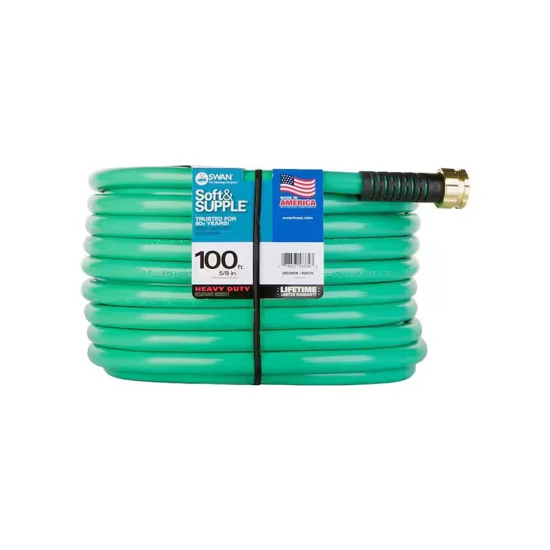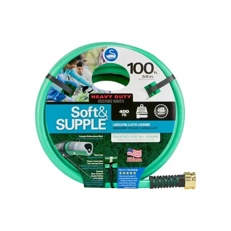 Trusted for more than 50 years, Swan's Soft&SUPPLE water hose offers a unique combination in garden hoses for the homeowner.It has a high 400 PSI burst strength to give you a powerful water flow, as well as a thicker construction than average garden hoses for strength and reinforcement. It also has a soft and supple abrasion-resistant exterior, making it comfortable to the touch and effortless to unwind and unravel.This heavy-duty yet soft garden hose is also an extremely flexible garden hose, so it can move with ease around trees, flowerbeds and other obstacles across your lawn, saving you time and energy, as well as protecting you from injury.The soft and supple flexible water hose also features our patented Hose Armour at the female coupling to prevent kinking at the water source. Aluminum couplings, crush-proof up to 4,000 pounds per square inch, give you peace of mind in case you accidentally run over the soft garden water hose with a lawn mower or other garden equipment.The Soft&SUPPLE flexible hose is available in both 5/8-inch and 3/4-inch inside-diameter sizes, as well as a variety of lengths to satisfy all of your gardening and outdoor needs.