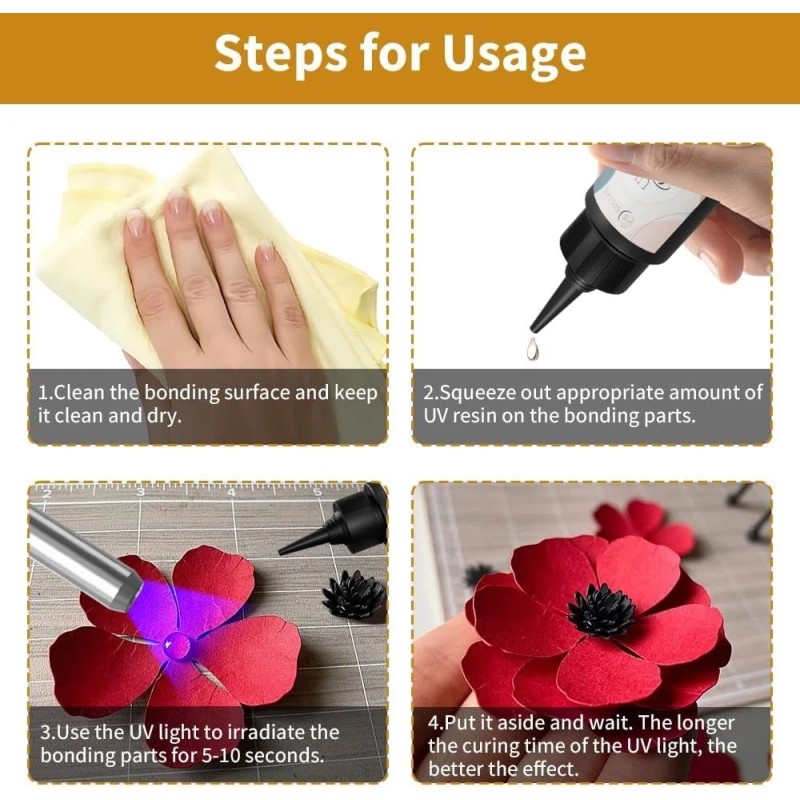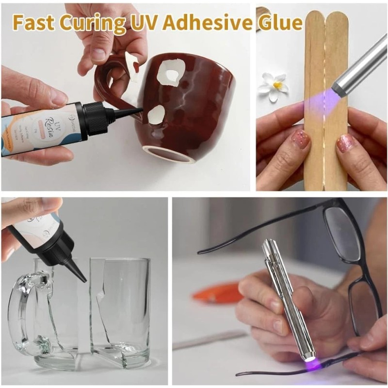 • UV Resin Kit with Flashlight: Our UV bonding glue is made by good quality and non-toxic material. If you have any question about our UV resin kit, please do not hesitate to contact us, and we will try our best to help you solve your problem