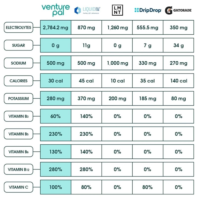 Venture Pal Hydration Boost is packed with the 7 essential electrolytes, among which sodium is the electrolyte that we lose the most through sweat. Getting about 20% of your daily value in electrolyte powders is usually right for most people.