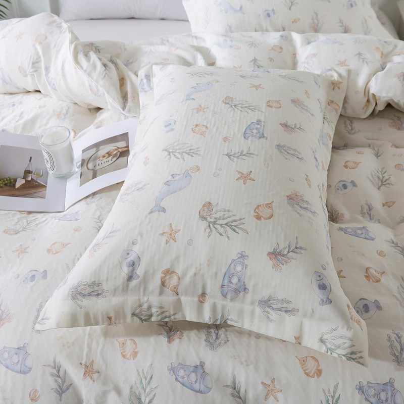 • Featuring playful dolphins, fish, and starfish in soft pastel colors, this design brings a fun and relaxing seaside vibe to your bedroom.The airy, gauze-like texture keeps you cool and comfortable, making it perfect for spring and summer sleeping.