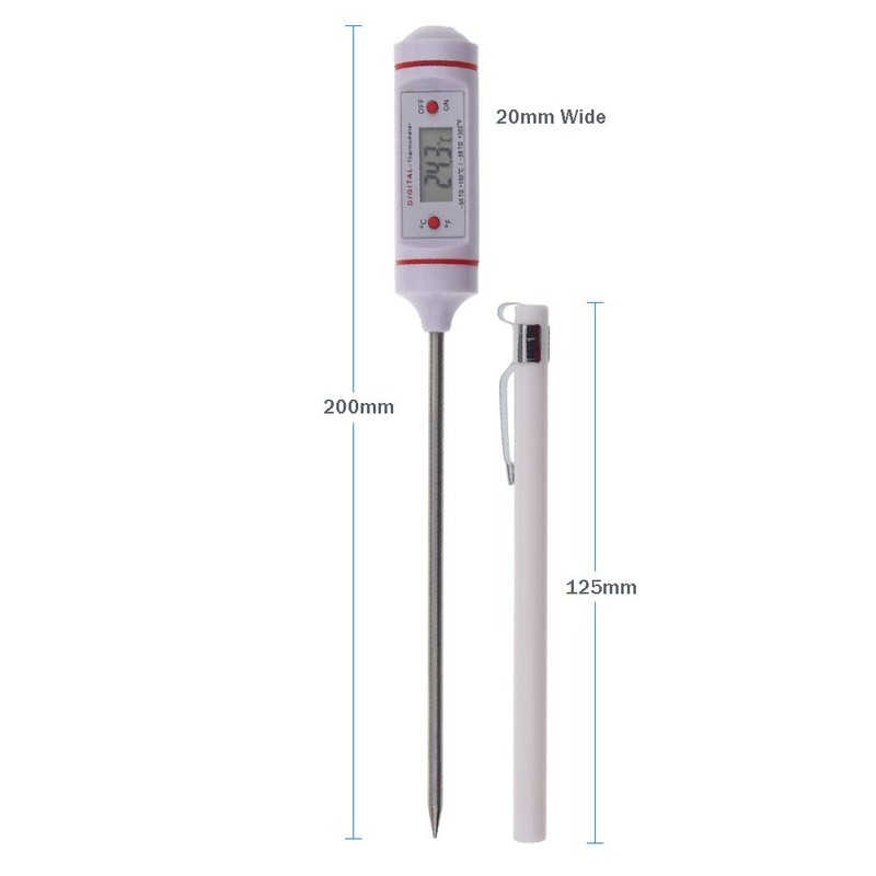 - The thermometer has a 120mm stainless steel probe and is supplied complete with probe cover, clip and battery