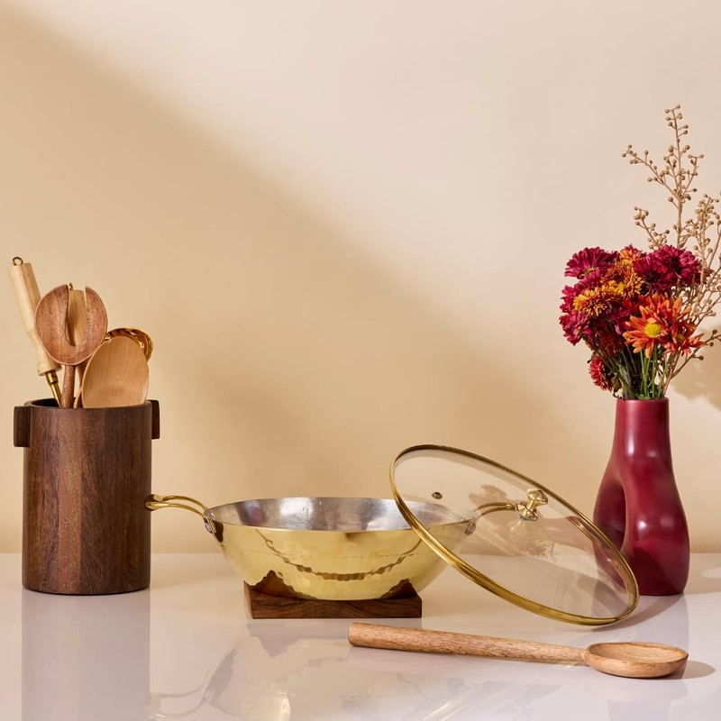 Brass Wok With a Lid, Kadhai, Nonstick Wok Pan with a Tin Coating, Non-Toxic Cookware with Ayurvedic Health Benefits, PFOA and PFAS Free (Glass Lid Flat Base)