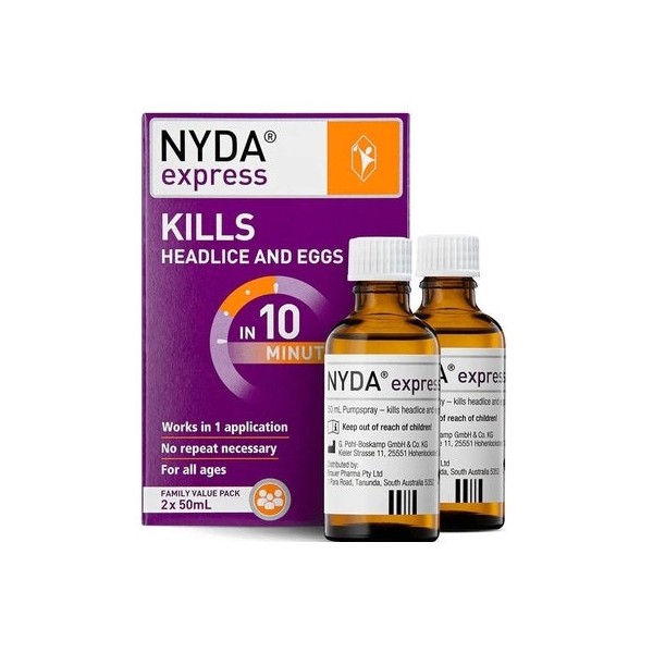 NYDA express is a 92% Dimethicone dual formula which initiates double action against lice and their eggs. The 2 different Dimethicones penetrate the breathing holes of headlice and their eggs to irreversibly suffocate headlice in all 3 stages of development. NYDA uses a physical mode of action, and the development of chemical resistance is less likely.
