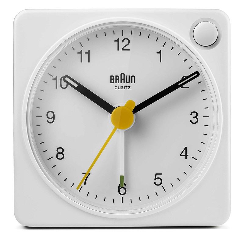 Braun Classic Analogue Travel Alarm Clock with Snooze Function and Light, Compact Size, Quiet Quartz Crescendo Alarm, White Model BC02XW
