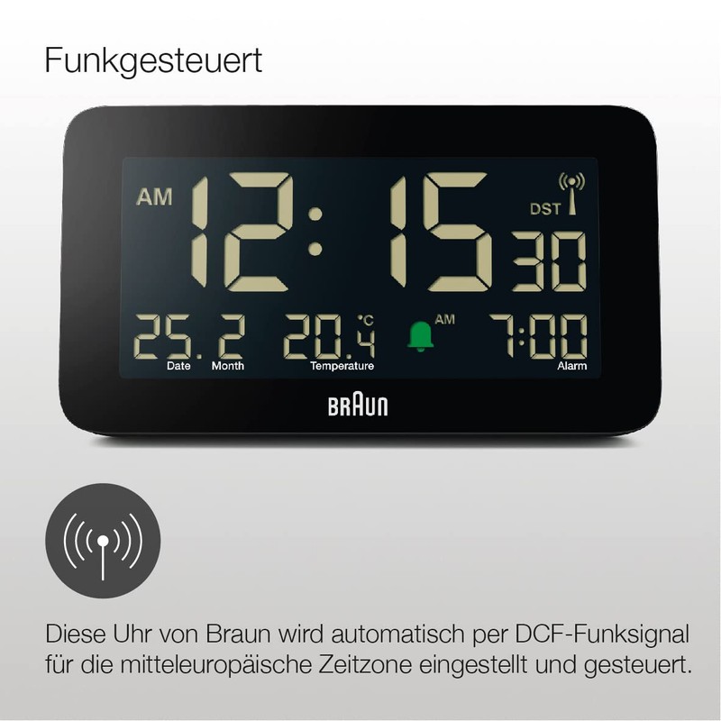 Braun Radio Digital Alarm Clock for Central European Time Zone (DCF) with Date, Month and Temperature Display, Negative LCD Display, Quick Setting, Black, Model BC10B-DCF