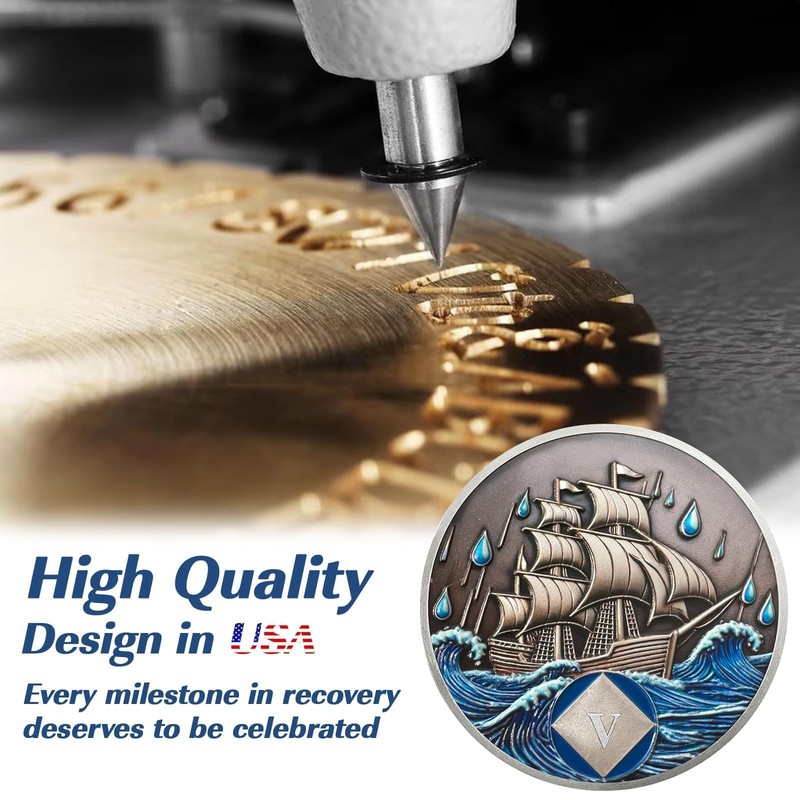- Power in Sobriety Design: This 5 year sobriety coin features a sailboat navigating through the rough seas, symbolizing the determination and tenacity needed on the road to success. The sobriety coin represents the challenges of overcoming addiction, reminding those on their journey to sobriety to stay resilient and focused. It’s the perfect sobriety gift, especially for those committed to addiction recovery