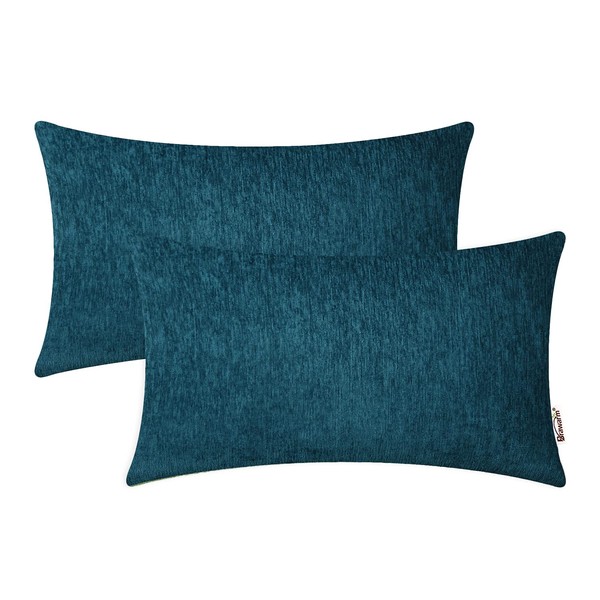 Brawarm Comfy Bolster Pillow Covers Cases for Couch Sofa Bed Solid Chenille Cozy Fuzzy Soft Striped Textured Lumbar Cushion Covers for Home Decorative 12 X 20 Inches Deep Lagoon Pack of 2