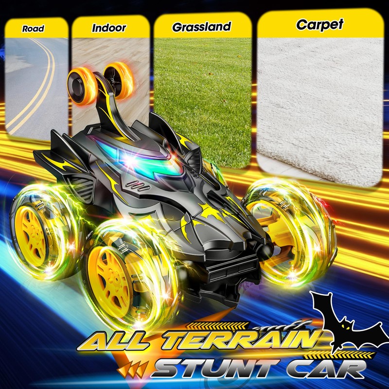 - 🦇【Coole Dynamische Mech-Design】Das Design in schwarz und gelb mit einem futuristischen Fledermauskörper, ausgestattet mit einer 360° drehbaren Vorderachse und verbreiterten rutschfesten Radnaben, bietet eine flexible und stabile Kontrolle. Die bunten Lichter blinken mit dem Auto, wecken die Neugier der Kinder, und ziehen leicht die Aufmerksamkeit von Kindern über 3 Jahre an.