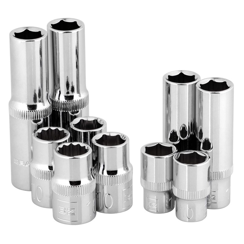 This set includes ten sockets: six 3/8" drive (two 6pt deep, two 12pt shallow, and two 6pt shallow) and four 1/4" drive (two 6pt shallow and two 6pt deep)