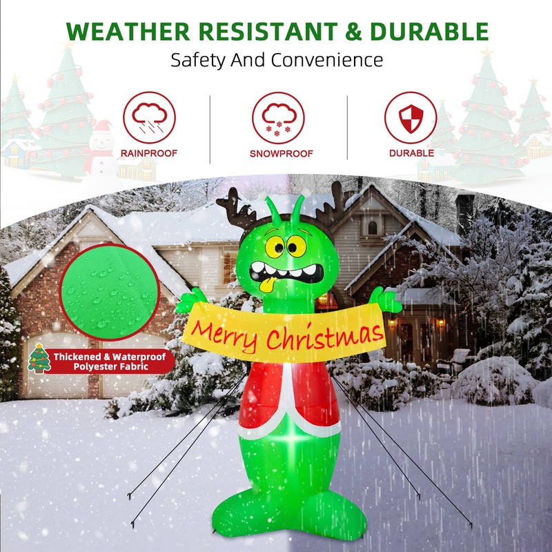 - Premium & Durable Material: Our Alien Christmas outdoor decorations are made of 190T waterproof thickened polyester fabric, which can prevent tearing and ensure that it can confidently face any wind or rain challenge. Crafted with precision,this Christmas outdoor inflatables are not easily pierced by sharp objects. The vibrant colors will not fade over time, allowing your alien inflatable Christmas yard decorations to maintain its bright and merry appearance throughout the holiday season