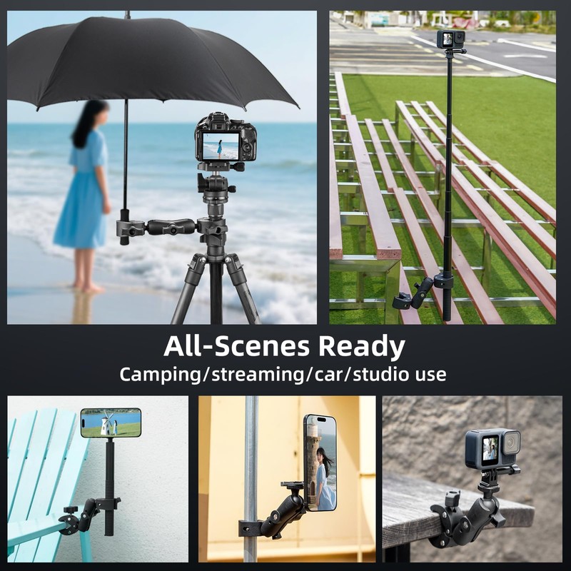 - DUAL-CLAMP SYSTEM WITH 360° FLEXIBILITY - Features dual magic socket arms connecting to twin clamp bases, easily adjust fixture positions via knobs for full 360° rotation. Perfect for securing accessories during photography/videography when extra support tools are needed.