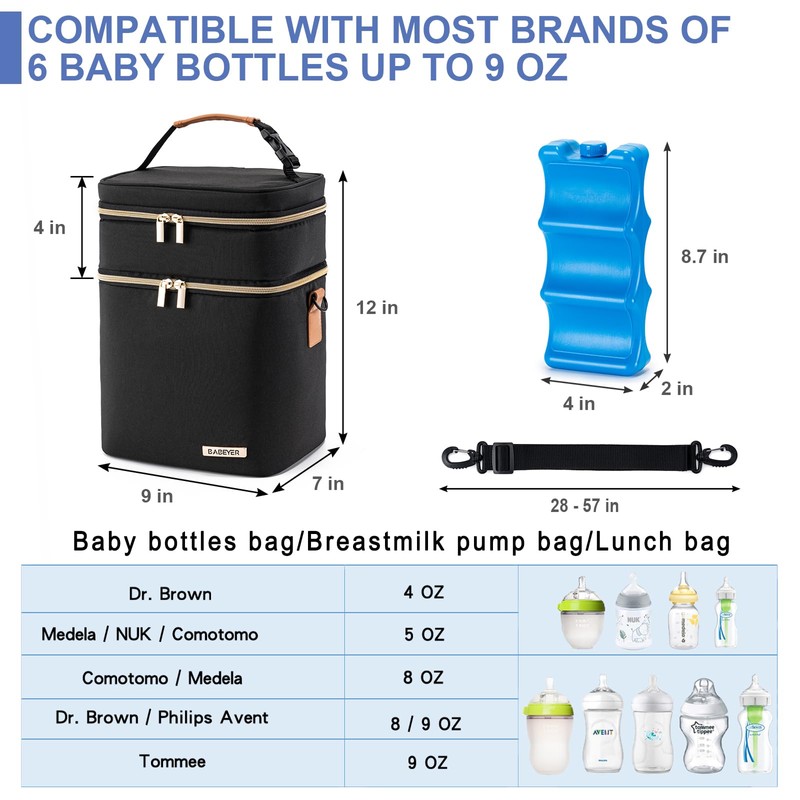 BABEYER Breastmilk Cooler Bag with Ice Pack Fits 6 Baby Bottles Up to 9 Ounce, Double Deck Leak-Proof Baby Bottles Bag with Shoulder Strap for Nursing & Working Mom, Black