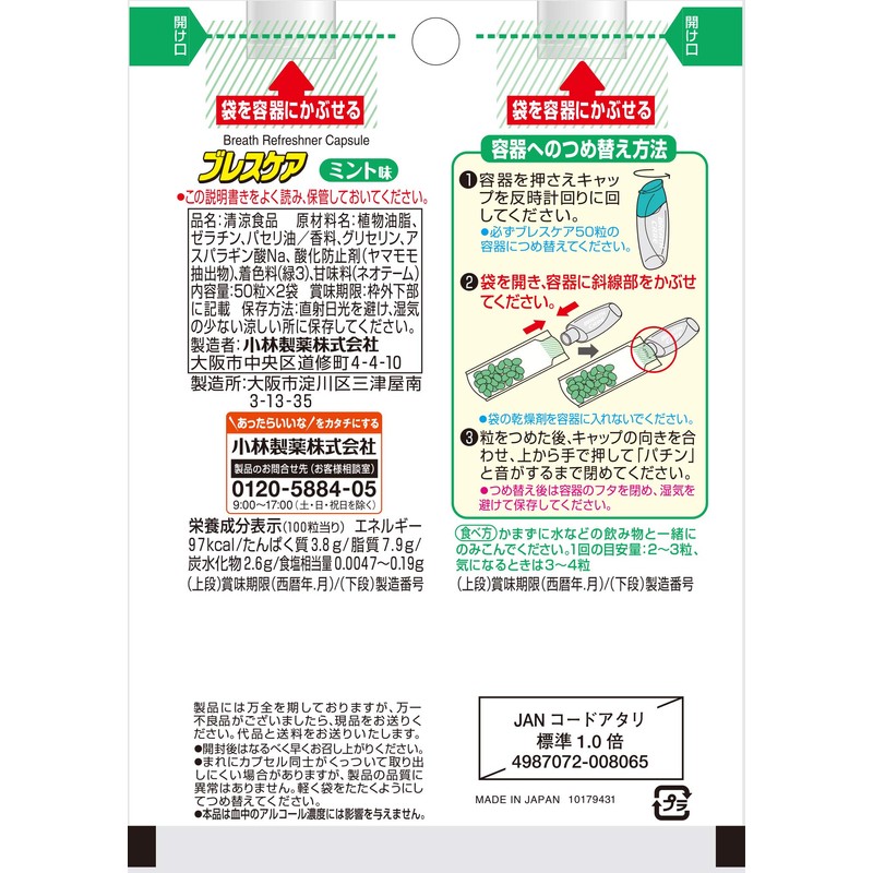 Breath Care Breath Cooling Capsules, Mint, Refill, 100 Tablets x 2 (200 Capsules)