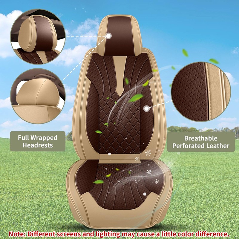 - đăVentilated Perforated Faux LeatherăThis breathable auto seat cover is made of simulated leather, perforated design, with large ventilation holes in the cushion and backrest part, which enhances breathability and keeps you cool and comfortable while driving. Suitable for all seasons, especially for summer.