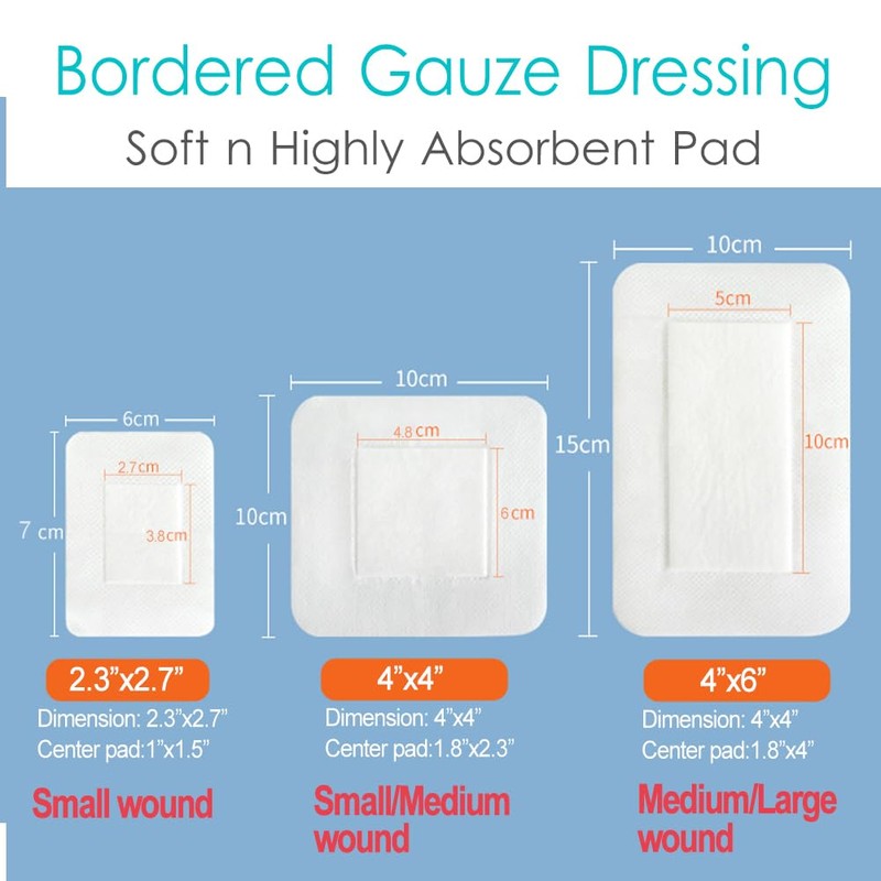 - Disposable Wound Care Dressing Pads: The adhesive island wound dressings are 4x6" and can cover the wound very well. Once applied, they completely protect the wound that is covered by the center pad. You will receive 10 pieces of bordered gauzes, which are sufficient to meet your needs and replacement. Essentials for home care and first aid kits. This pads are ideal for going out, travel, by car, sleep, daily working.