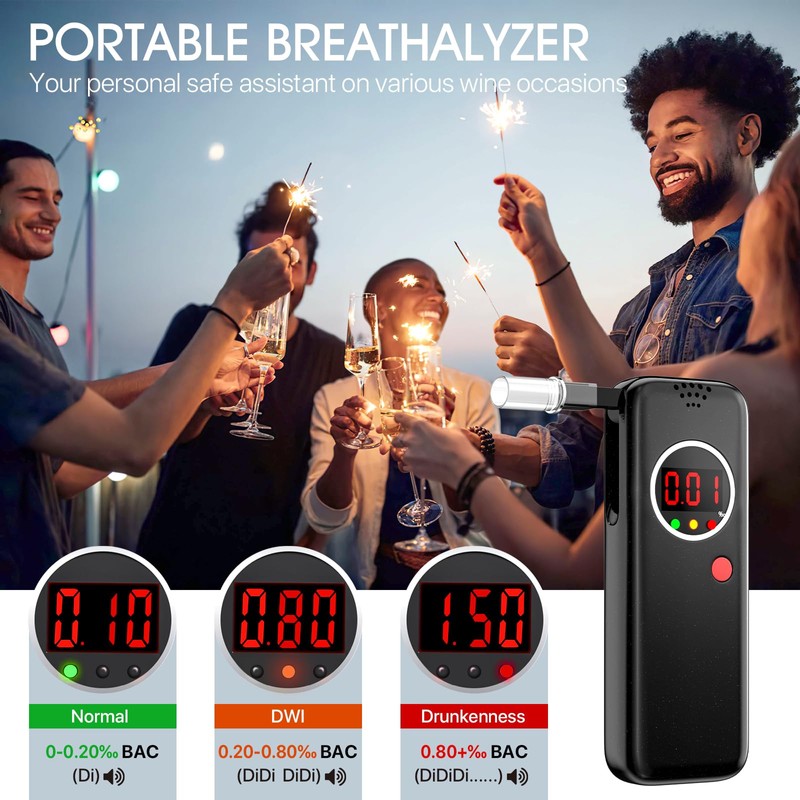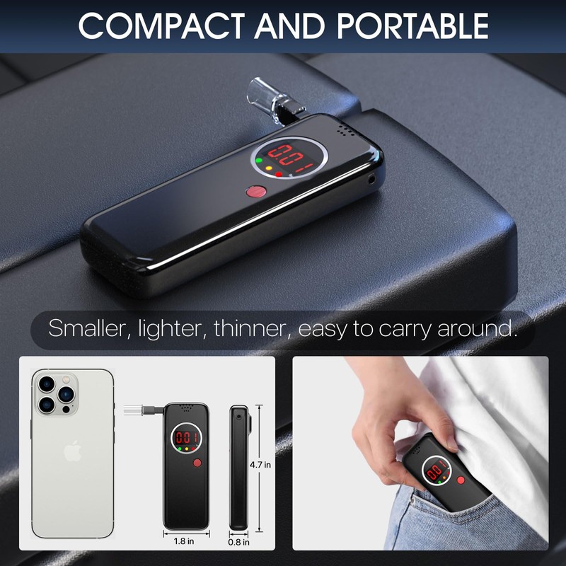 • 【Portable Breathalyzer】Our breathalyzer tester is smaller than a cell phone, so it won't take up much space in your car or bag. Plus, we provide an exquisite storage bag for even more convenient and secure carrying when you are on the go. Suitable for personal, professional, driver, party, and family use.