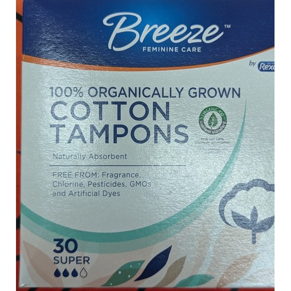 Breeze Feminine Care 100% Organically Grown Cotton Tampons 30 Ct - Super