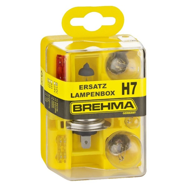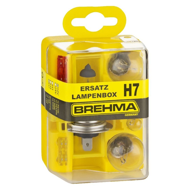 BREHMA replacement bulb box 8 pieces consisting of: - 1x H7 halogen bulb 55 watt - 1x R5W ball lamp - 1x 21/5W ball lamp - 1x P21W ball lamp - 1x W5W glass base lamp - 1x blade fuse 10A - 1x blade fuse 15A - 1x blade fuse 20A
