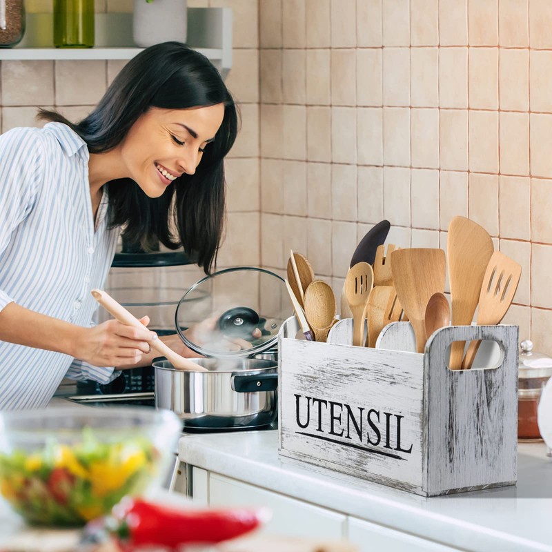 - ORGANIZE IN STYLE: This utensil holder made of high-quality, solid paulownia wood, will last for a lifetime and the solid,goes with your farmhouse decor.Rid yourself and your kitchen of daily clutter with this beautiful rustic. Get it to be the kitchen fashion leader in your neighborhood.