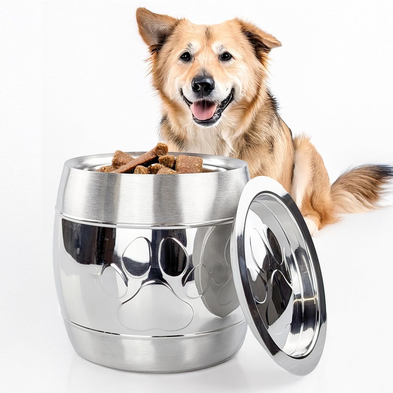 - STAINLESS STEEL BUILD: Dog treats container built with stainless steel that resists stains and is easy to clean, preventing bacterial growth, ensuring treats stay fresh and safe for your furry friend.