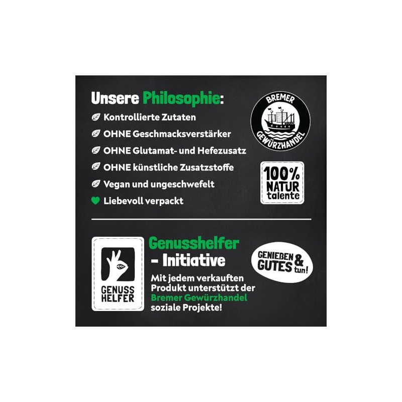 • Genushelfer: As part of our Genushelfer-Initiative, we donate five cents for every product sold to social projects from Bremer Gewürzhandel. Help and enjoy together!