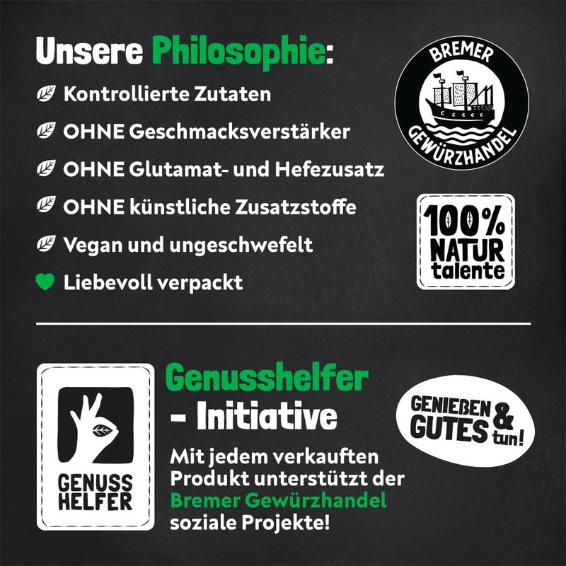 - Genushelfer: As part of our Genushelfer-Initiative, we donate 5 cents for every product sold to social projects from Bremer Gewürzhandel. Help and enjoy together!
