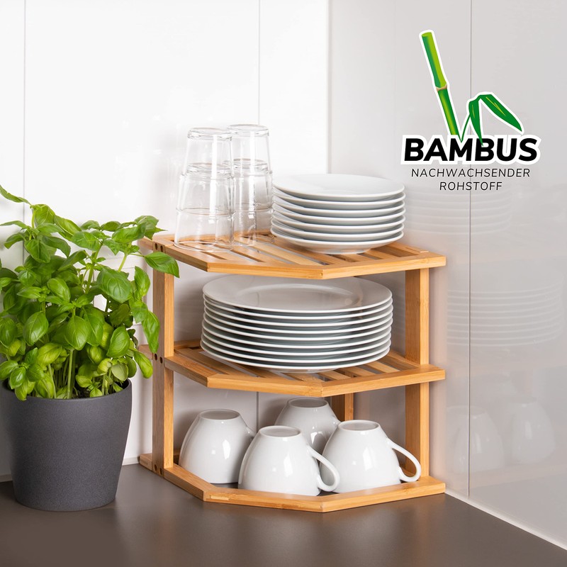 - Design - Your new shelf impresses with clean lines and the warm tone of the bamboo used. So the corner shelf fits perfectly with any existing decor. One level is open, without base. This level turned upwards, the middle level gets a rail for e.g. bottles - modern design can be so versatile
