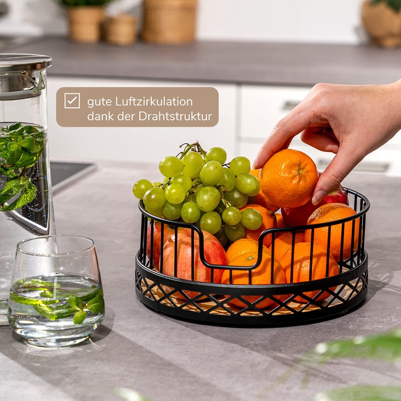- Decorative – the fruit basket is a successful design object in a classic style and forms a perfect place for apple etc. The matt black metal struts with a base insert made of sustainable bamboo form an absolute eye-catcher in contrast to the mostly colourful fruit. You have a clear view of the contents and with the fruit bowl an optical highlight in almost any place.