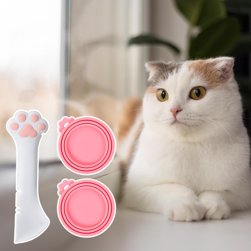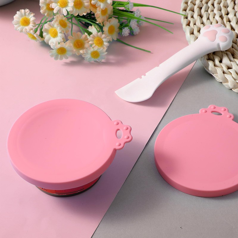 Bremorou 3 Pcs Cat Lids And Spatula Cute Paw Shape Opener Spatula Cat Wet Food Spoon Universal Bpa Free Silicone Can Lids & Spoon Mini Cat Treat Spoon For Dog Cat Cans Wet Or Dry (Pink, White)
