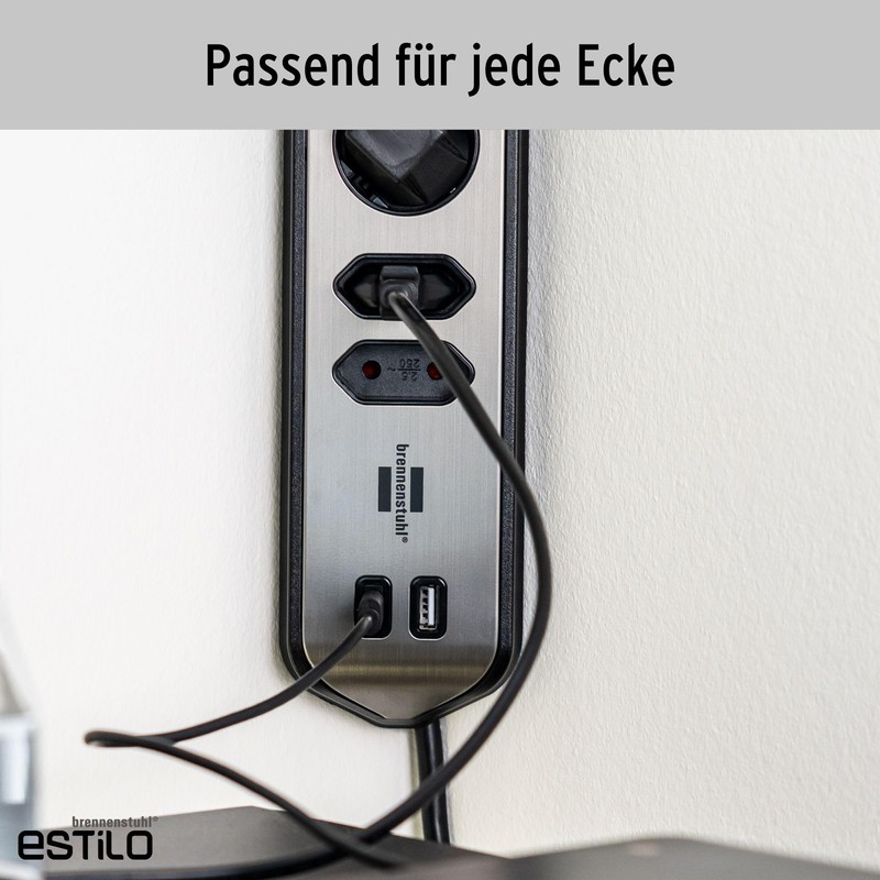 brennenstuhl® Estilo Corner Socket Strip 4-Way with USB A and USB C PD 30 W (Table Socket for Kitchen and Office, Corner Socket with 2 x Earthed Contact Sockets, 2 x Euro Sockets) Silver/Black