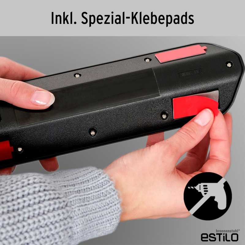- The corner socket strip can be easily attached with special adhesive pads (no drilling required) and can therefore be used variably