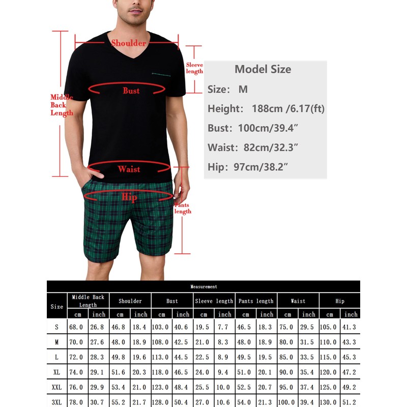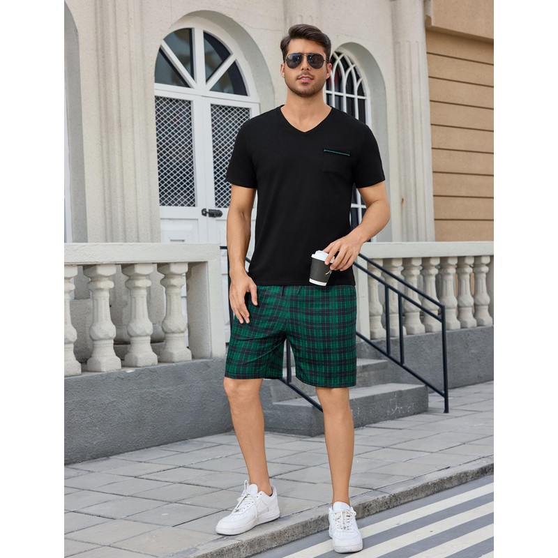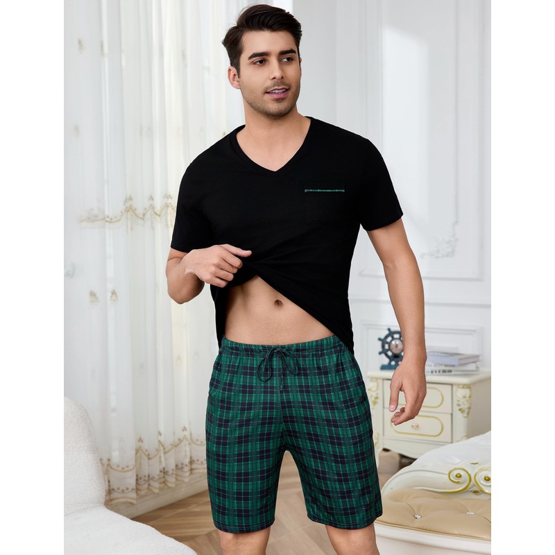 - Two-piece summer sleepwear set for men: short men's pyjamas/men's pyjamas short includes a short sleeve T-shirt and men's sleep shorts for summer. Short sleeve top with V-neck, men's pyjama bottoms with pockets