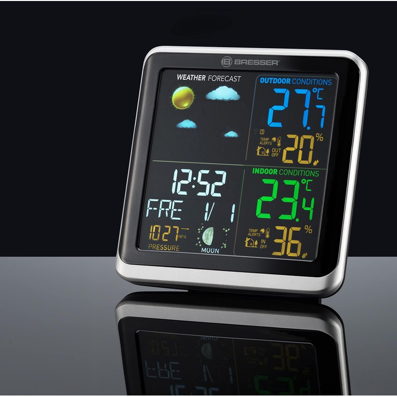 - LCD colour display with two brightness levels. Displays indoor temperature (°C/°F) and humidity, outdoor temperature (°C/°F) and humidity, barometer display in hPa, weather forecast for the next 12 hours (sunny, partly cloudy, cloudy, rainy, stormy, snowy)